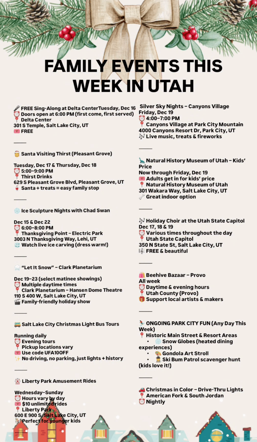 The Christmas tree in Draper is stunning and a must-see, especially if you have kids. Check it out here: https://www.instagram.com/p/DST6rzoET9F/